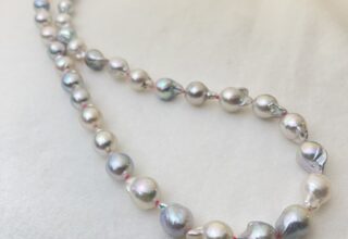 Akoya natural seawater pearl, 8-9mm baroque shape, all-knot with pink thread, 47cm, SV clip-clasp, made in Kobe, Japan.